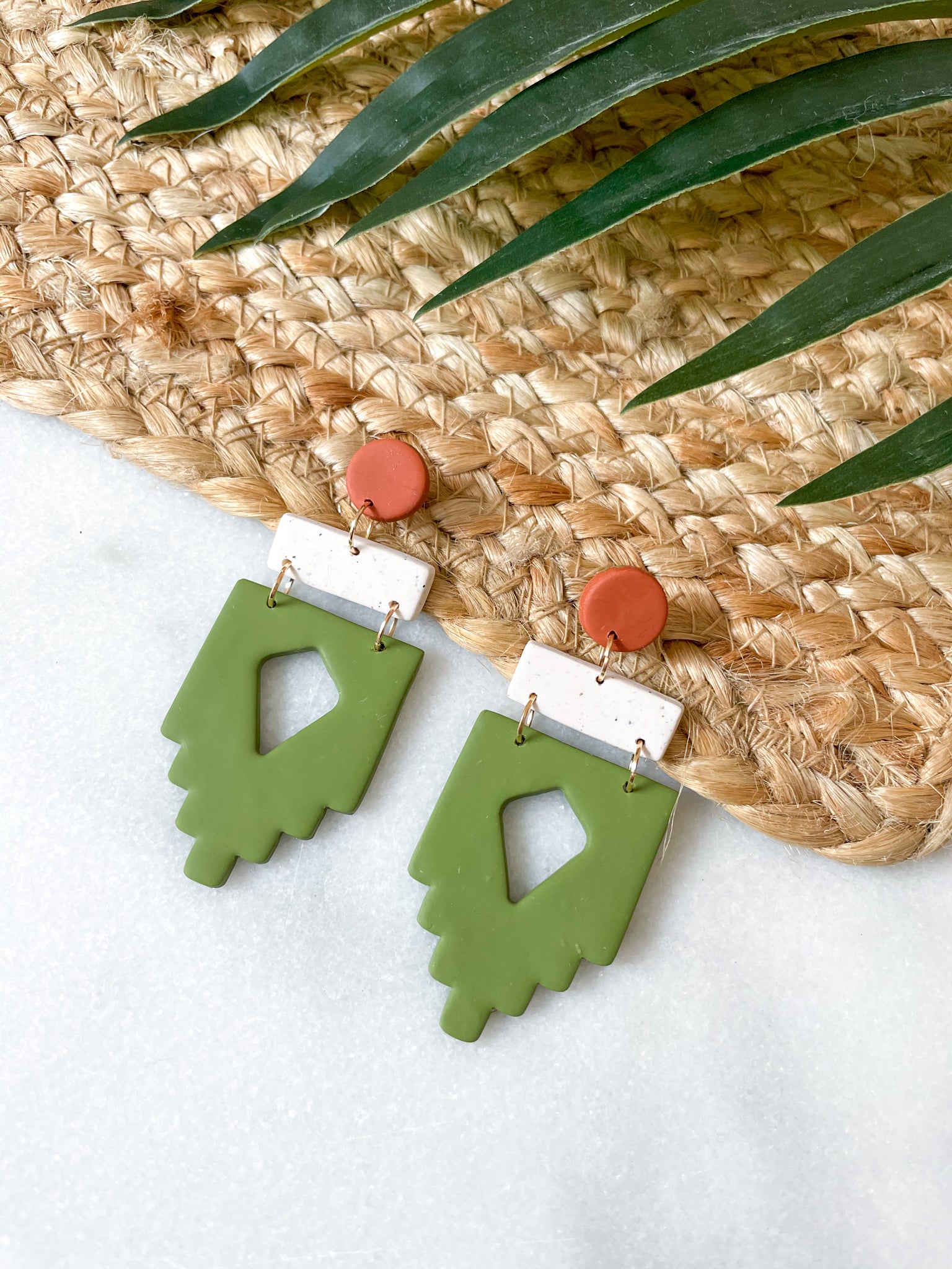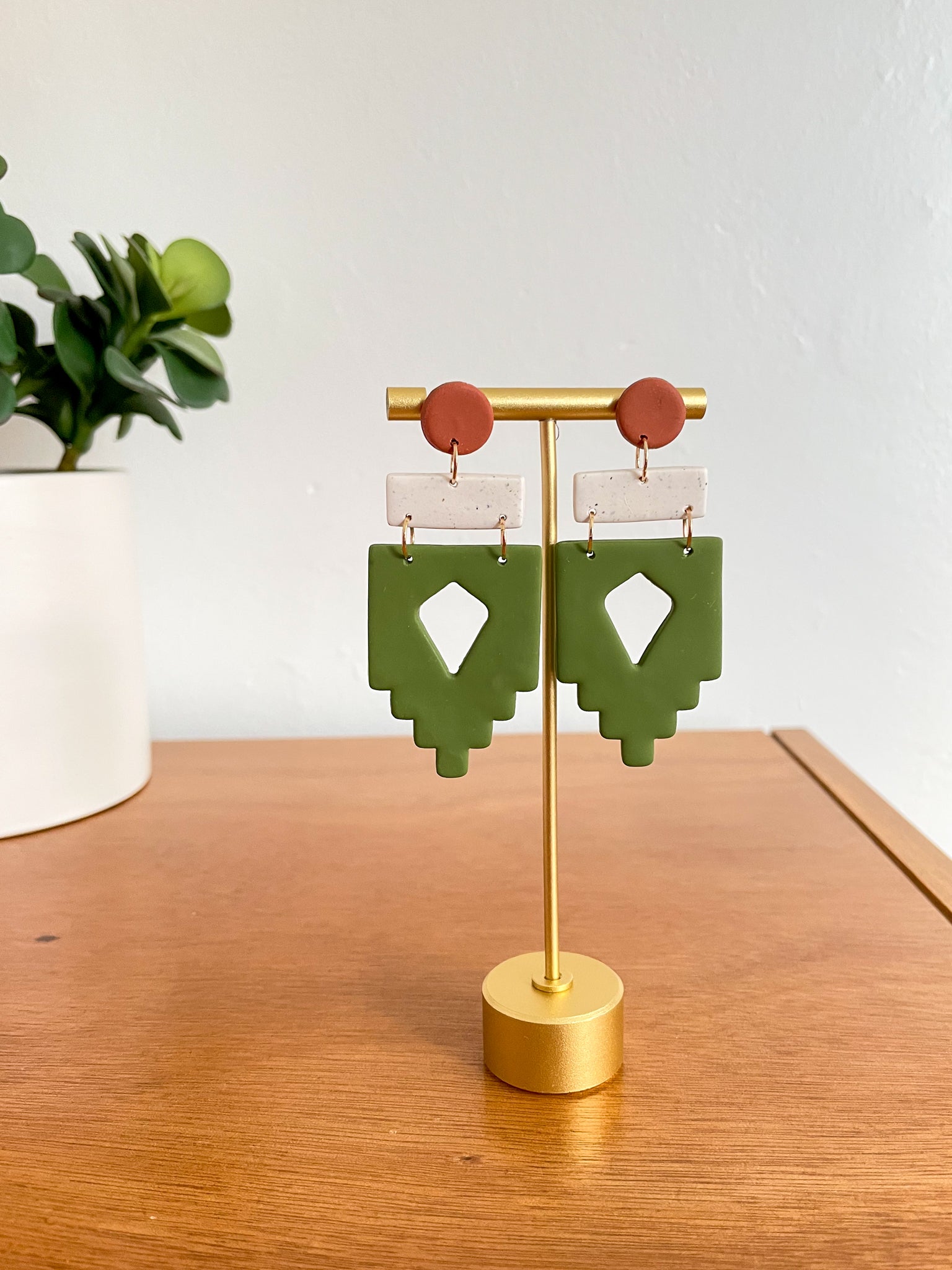 Shimmery olive green, speckled white, and terra-cotta Southwest-inspired polymer clay earrings. Gold-plated stainless steel posts. Approx. 2-½” total length, 1-¼” wide.